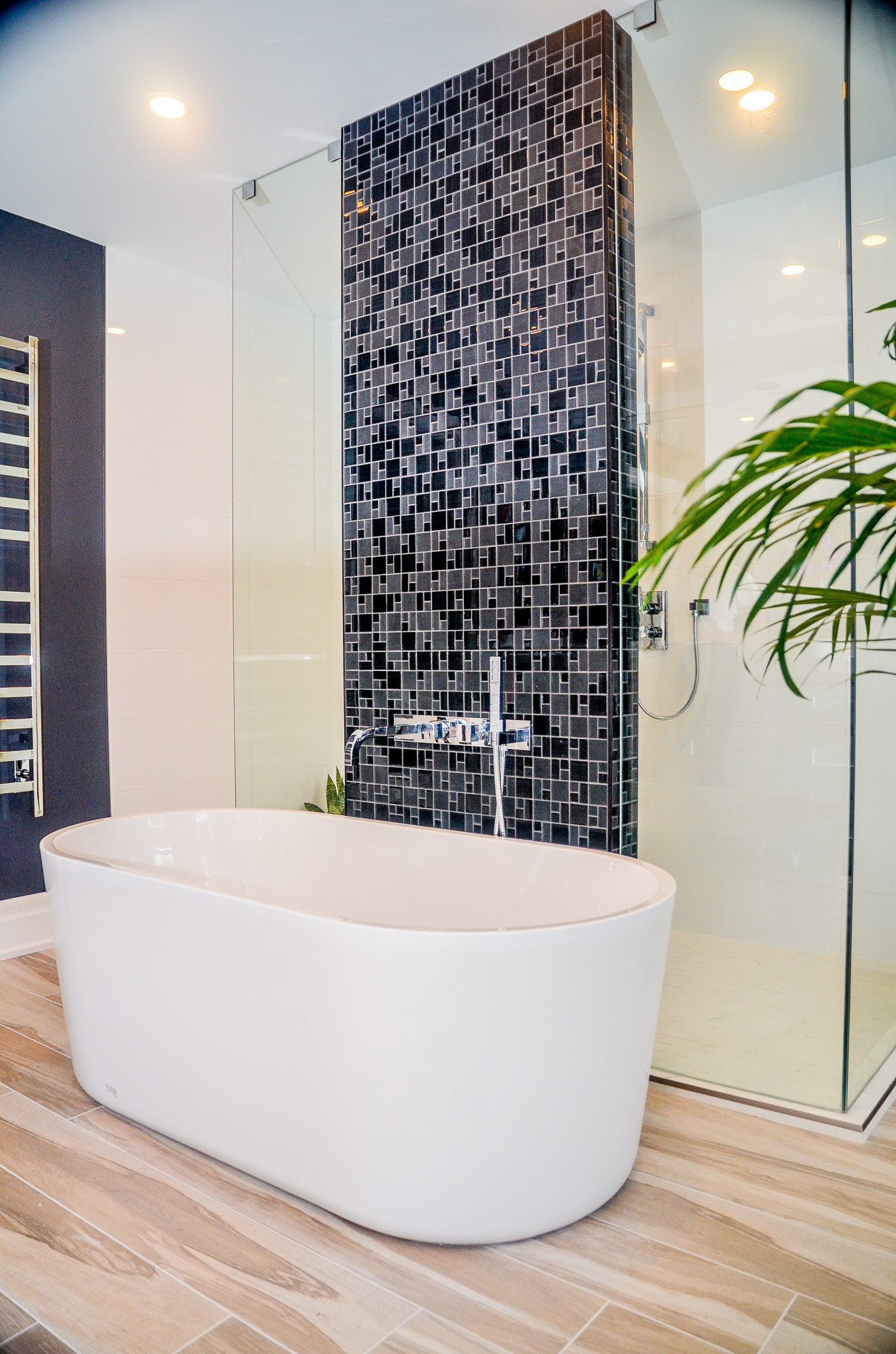 This bold ensuite featured a freestanding tub with a wall-mounted tub filler, partially hidden shower, and dramatic black walls with colorful decor. The quartz countertop incorporated a spacious makeup area as per the request of the customer.