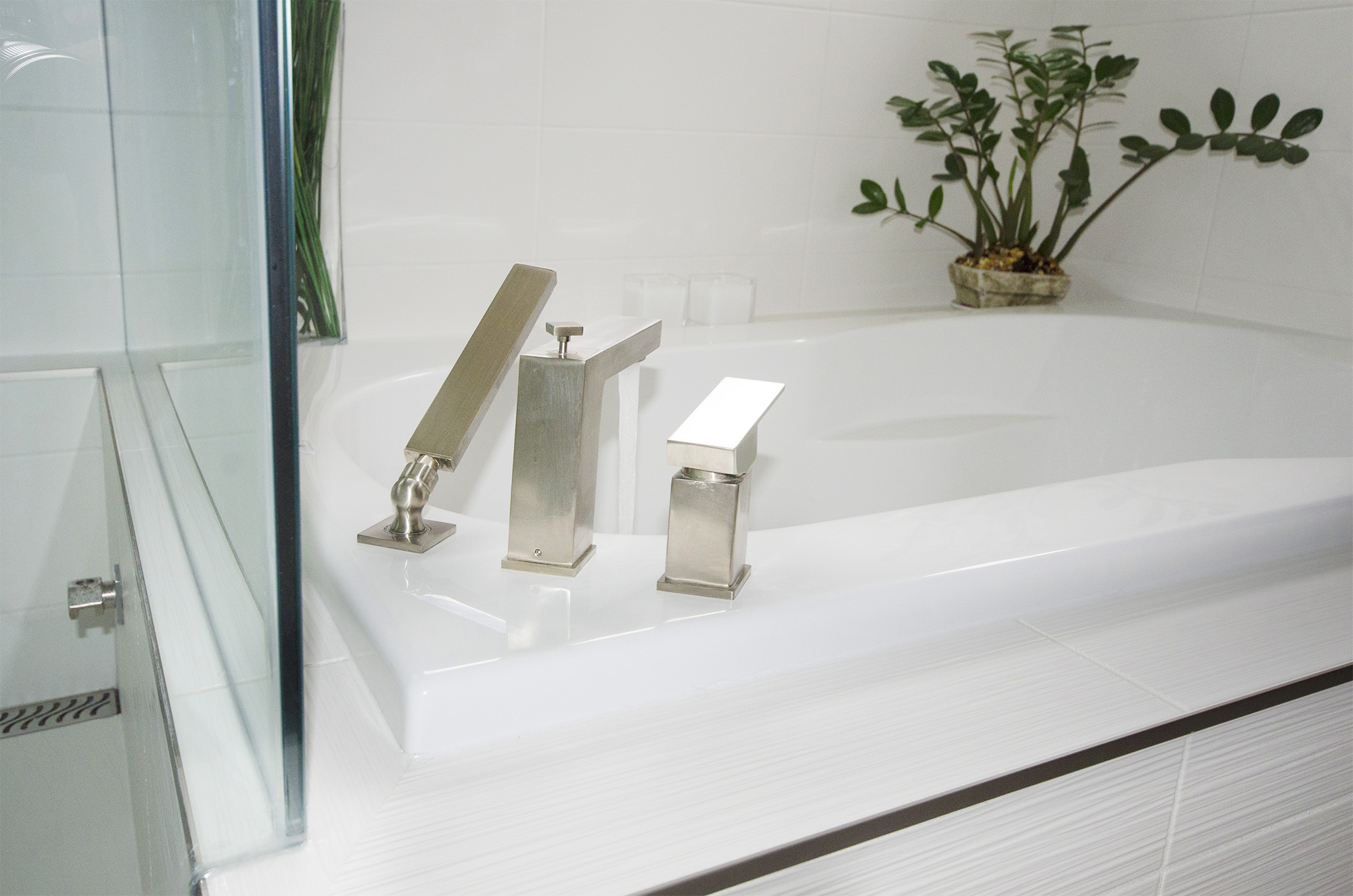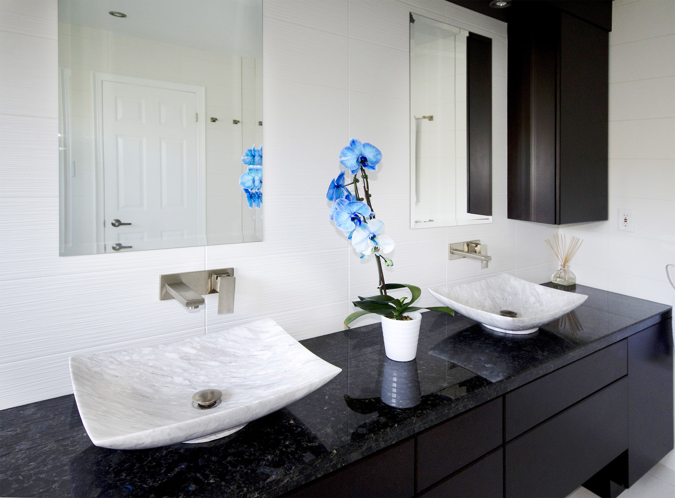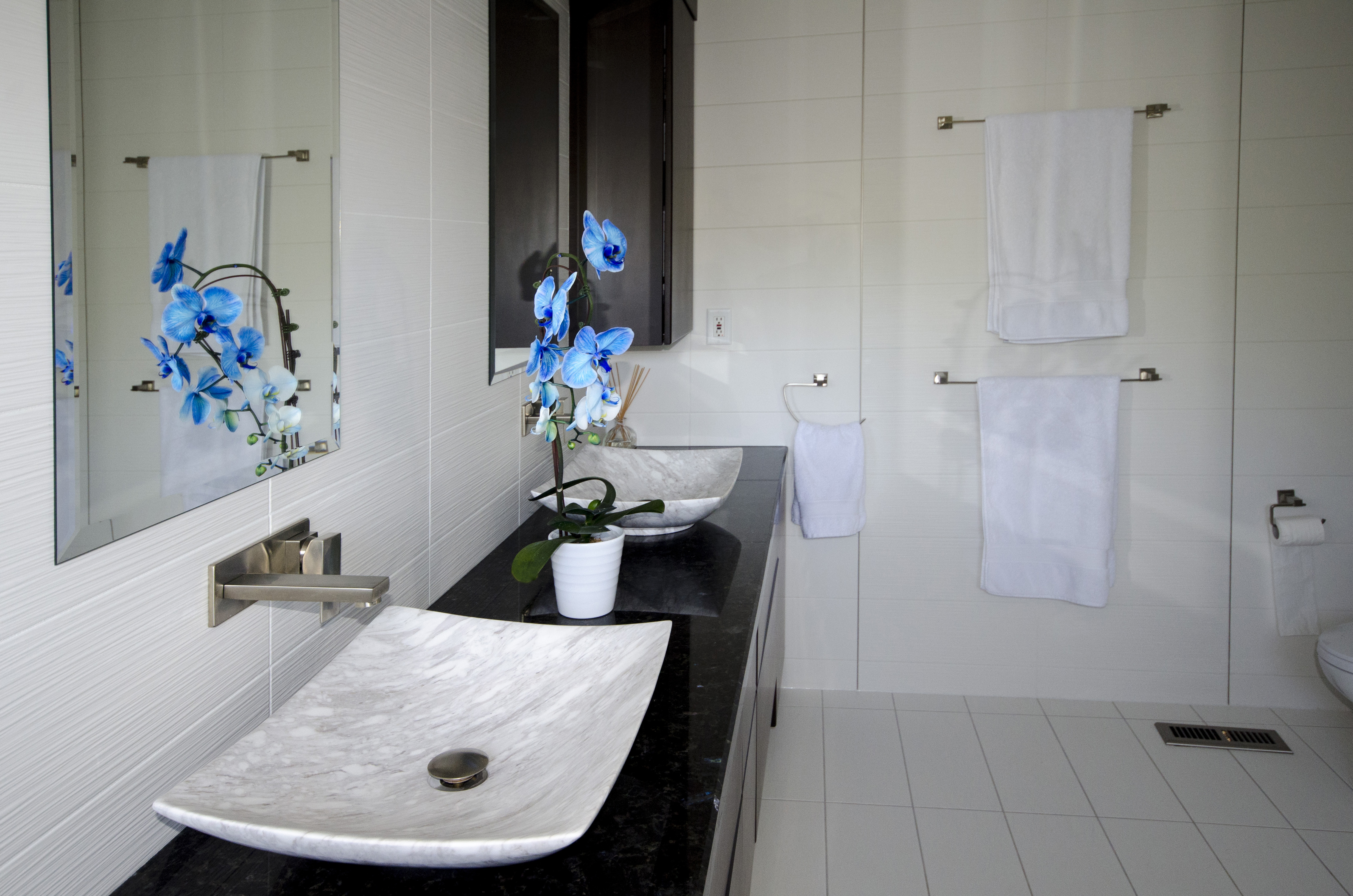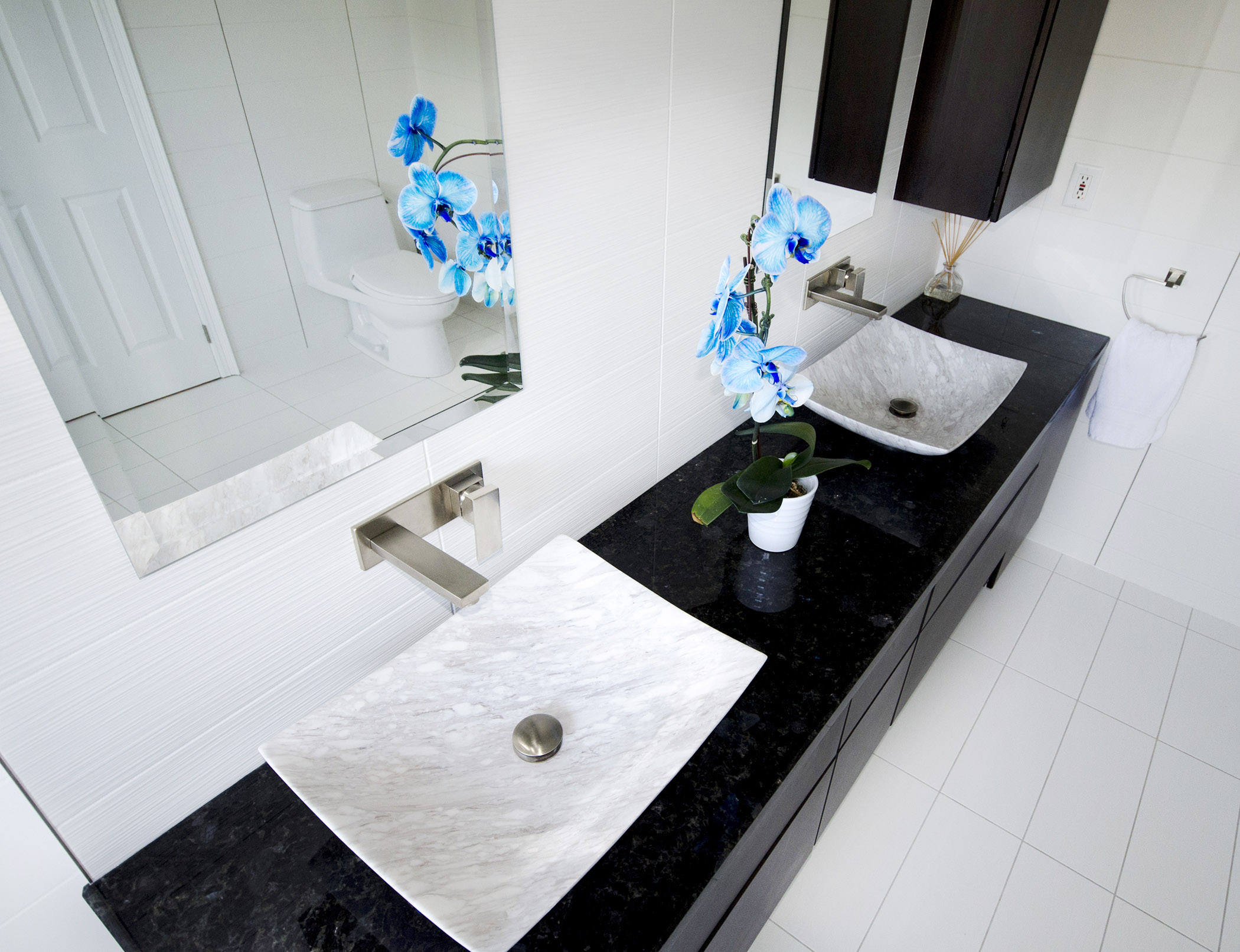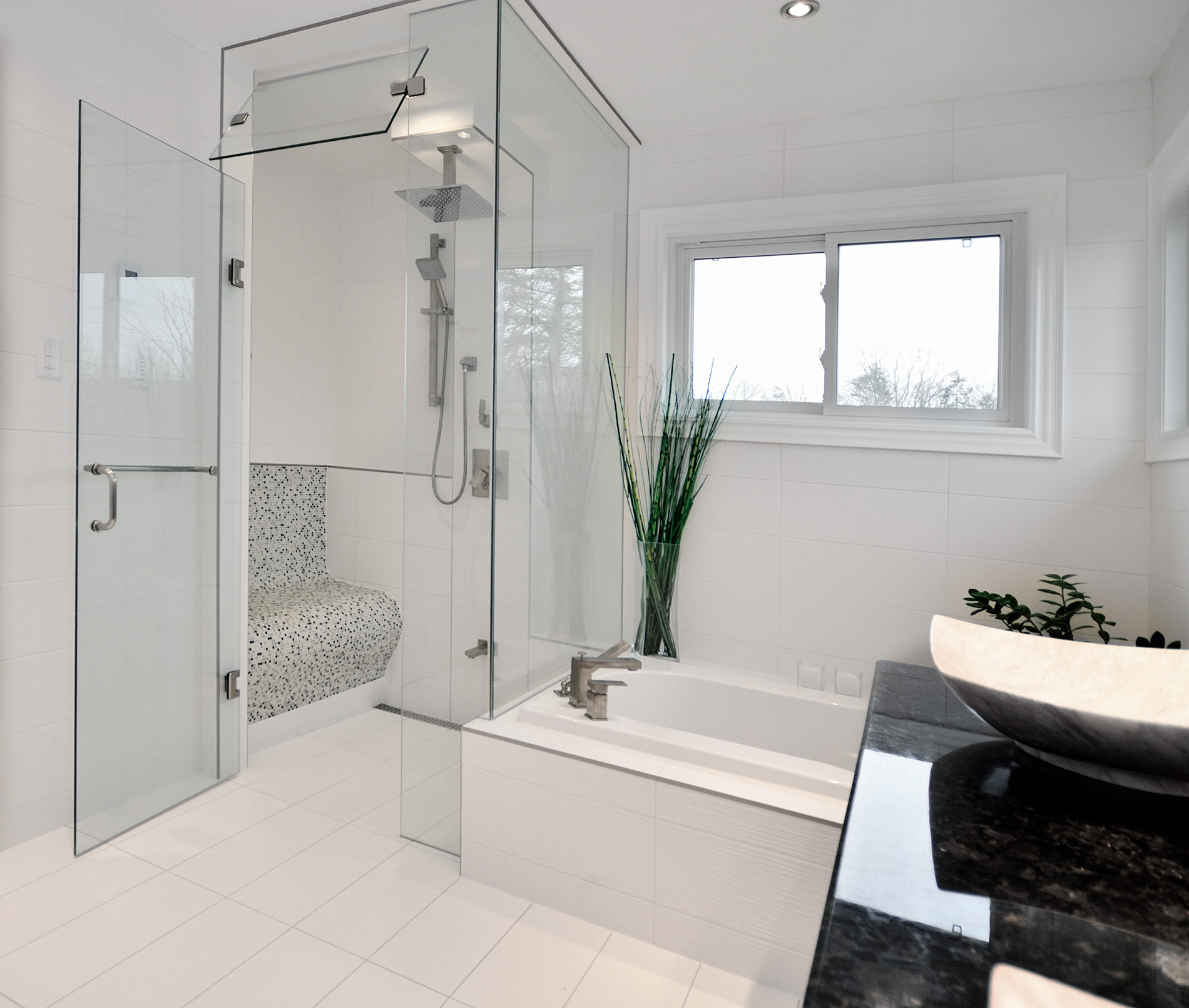 Floor & Bath Design designed and installed this modern white ensuite. It features a strapless steam shower with a custom-built bench, floor to ceiling wall ceramic tiles, floating double vanity and black, granite countertop.