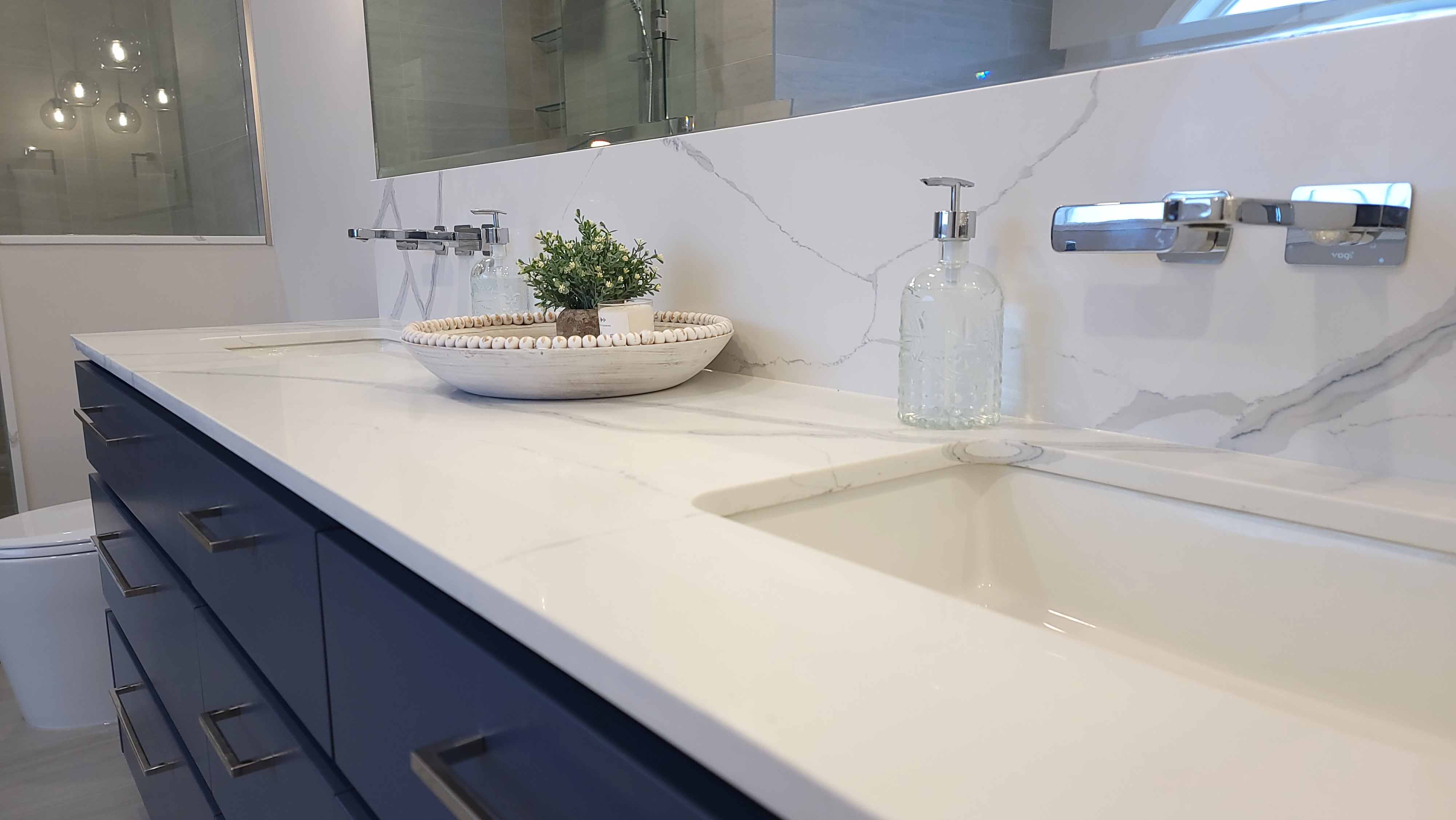 - Custom double-sink vanity with bold blue cabinets