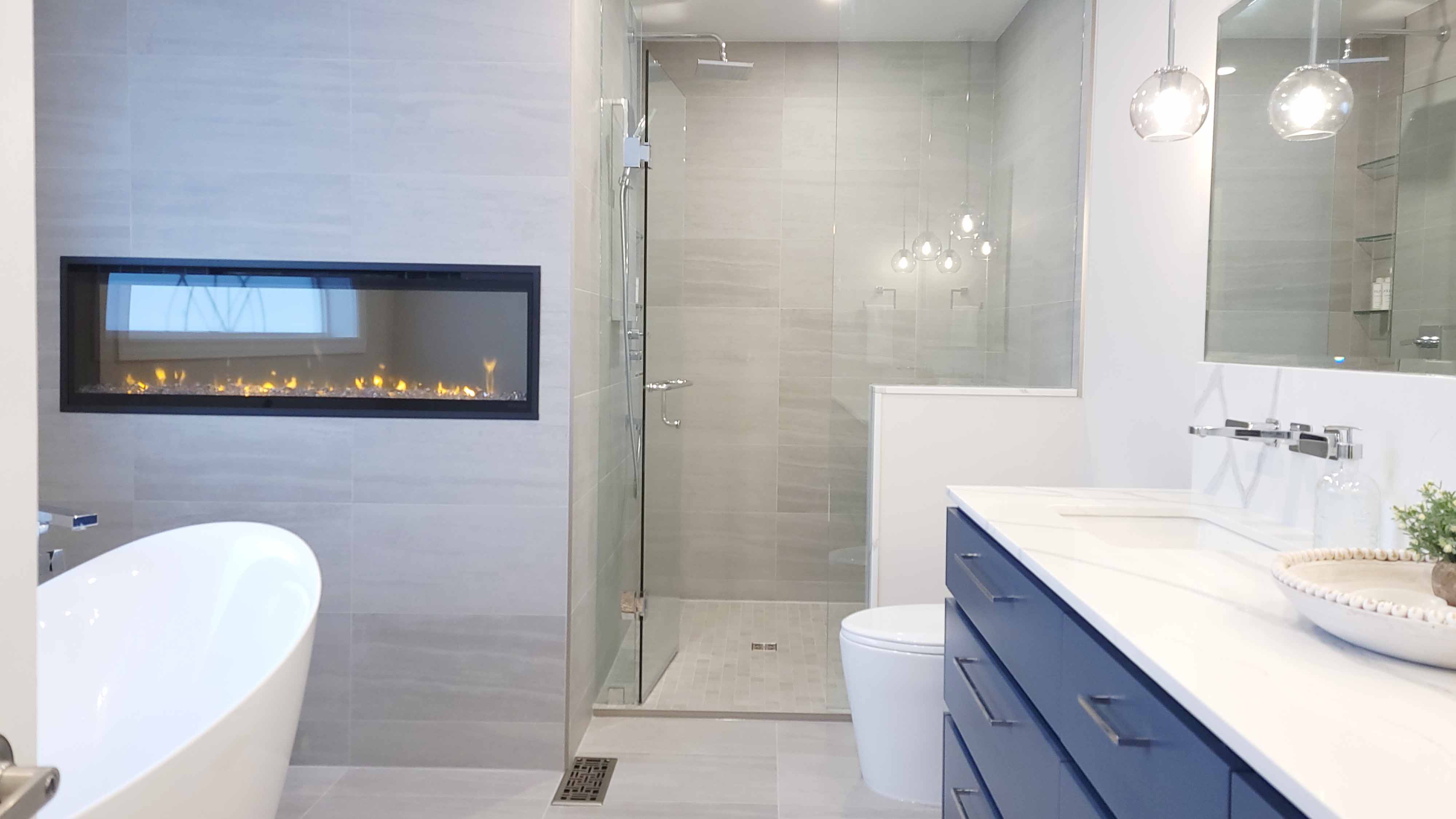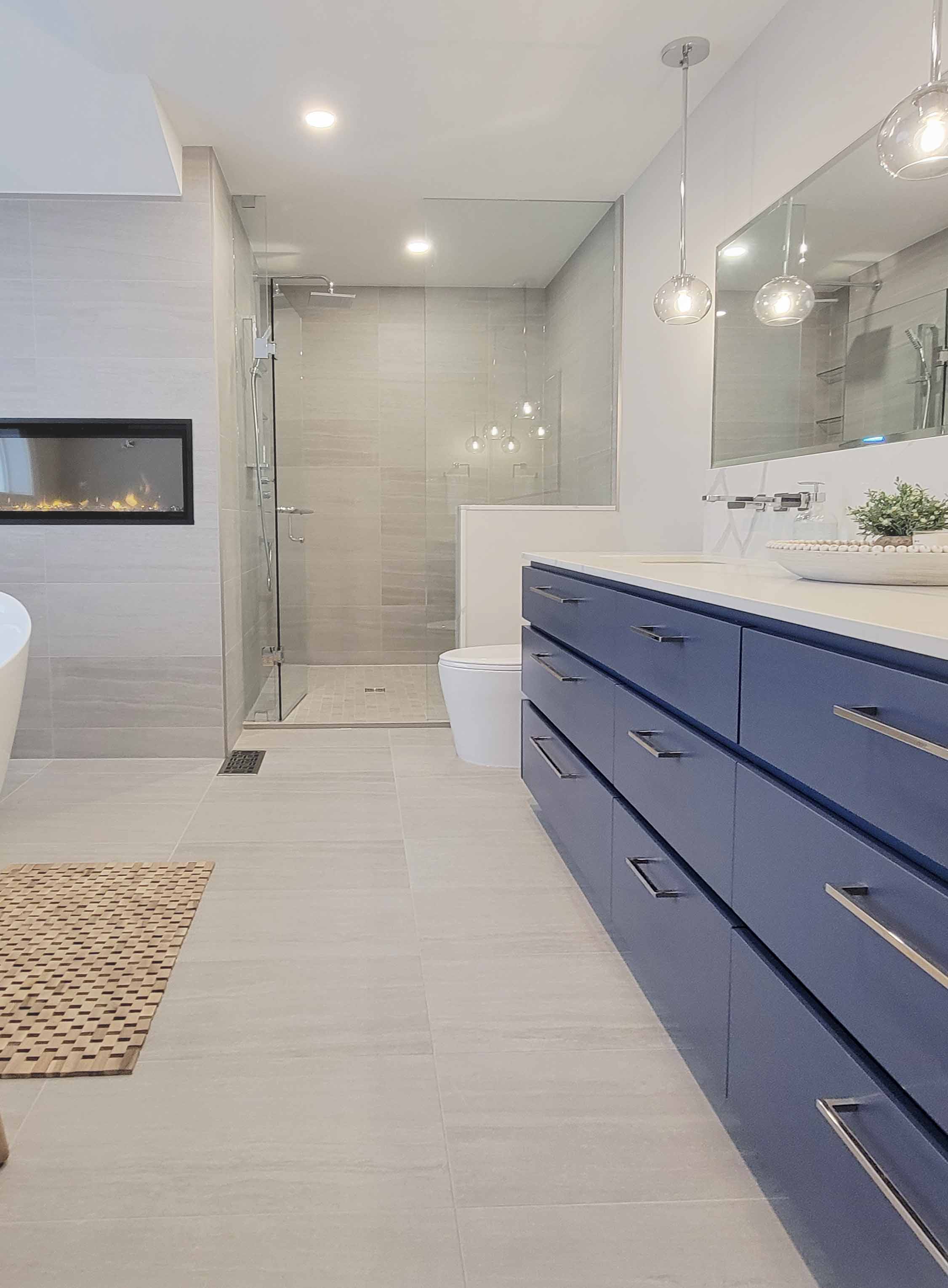 The goal for this Ajax ensuite was to create a warm, modern retreat without losing practical function. The gas fireplace instantly became a design anchor, setting the tone for a cozy, spa-like environment. Our team paired it with a sculptural free-standing tub positioned to capture the fireplace glow, giving the room a high-end boutique-hotel feel. The funky blue cabinetry adds personality while still offering smart storage solutions and a durable finish ideal for everyday use.