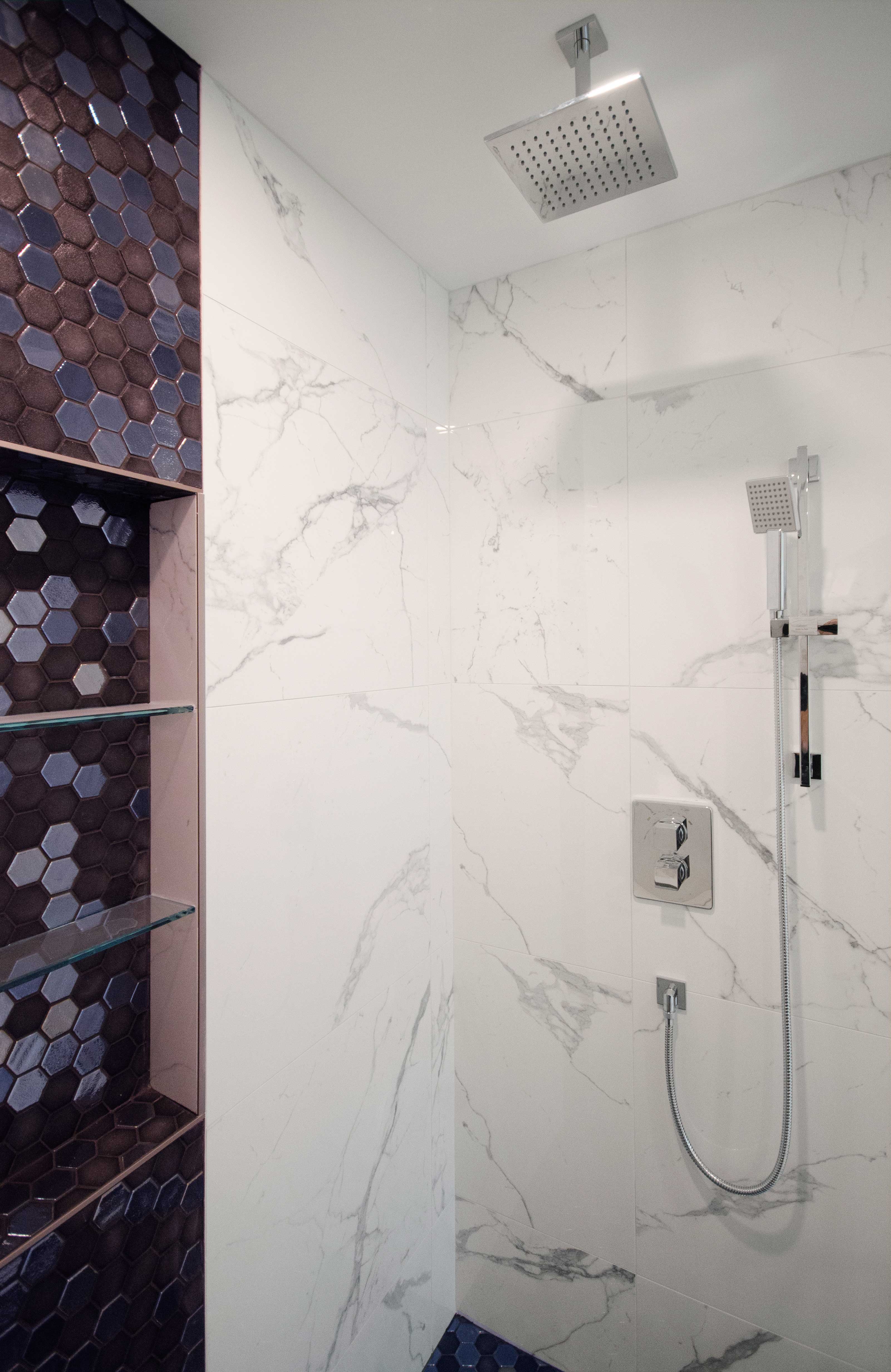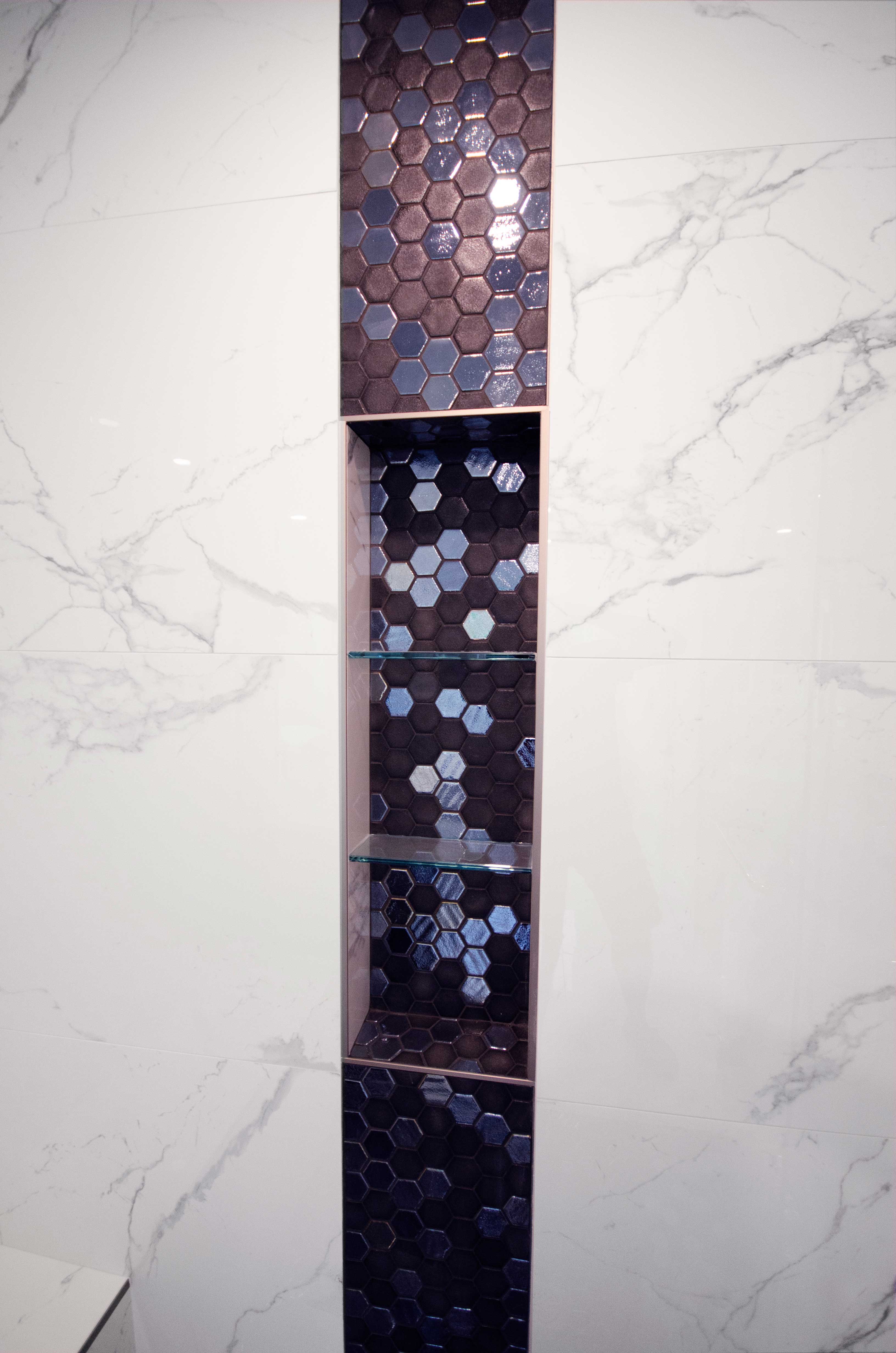 - Navy hexagonal mosaic accent tile