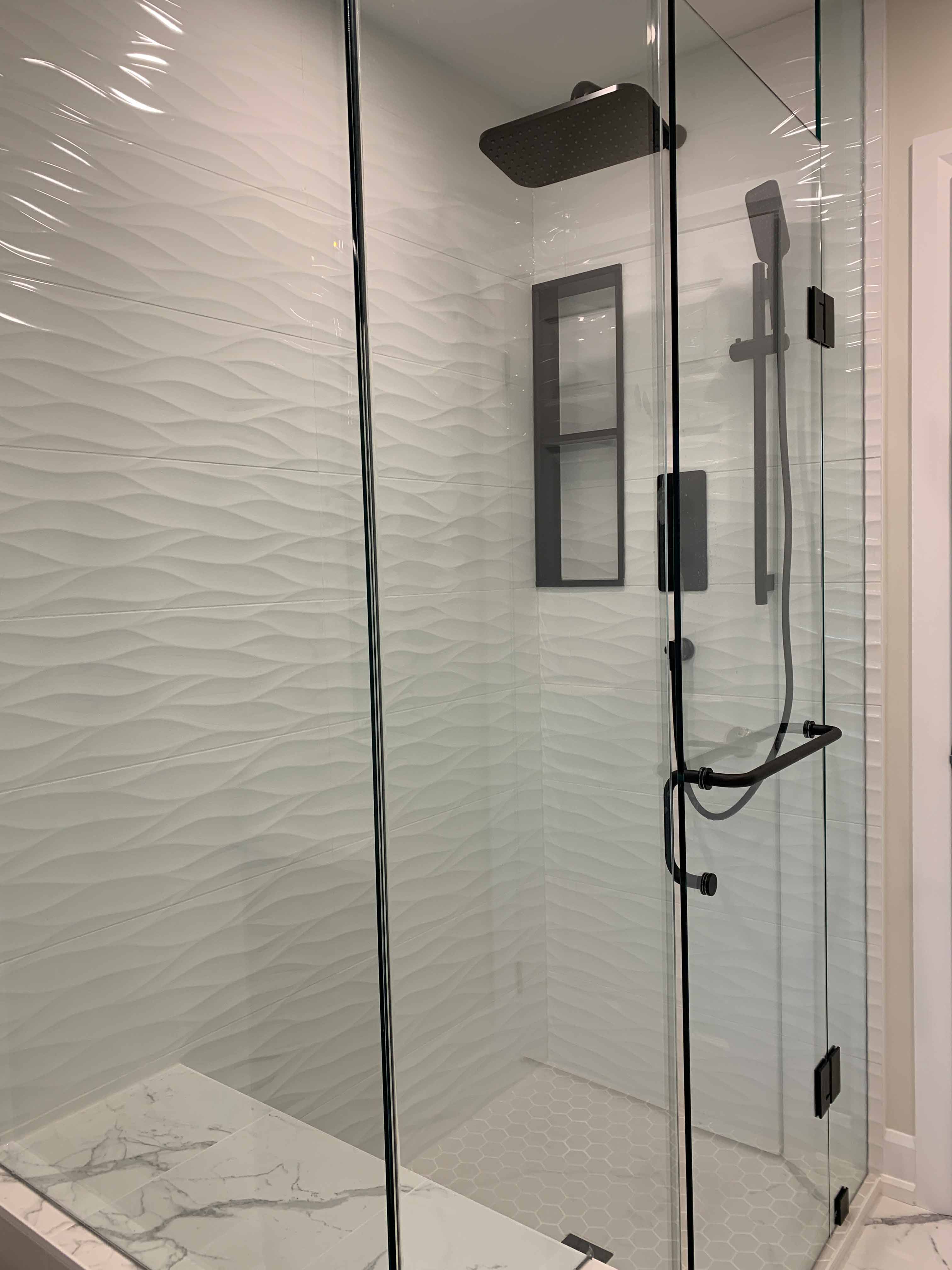 The standout element of this project is the 3D wavy wall tile installed across the shower walls. These sculptural tiles create depth and movement, giving the bathroom a dynamic, designer feel. To ground the space, we introduced a bold statuario floor tile. Its soft veining and polished finish bring a sense of luxury, while maintaining a clean, modern aesthetic.