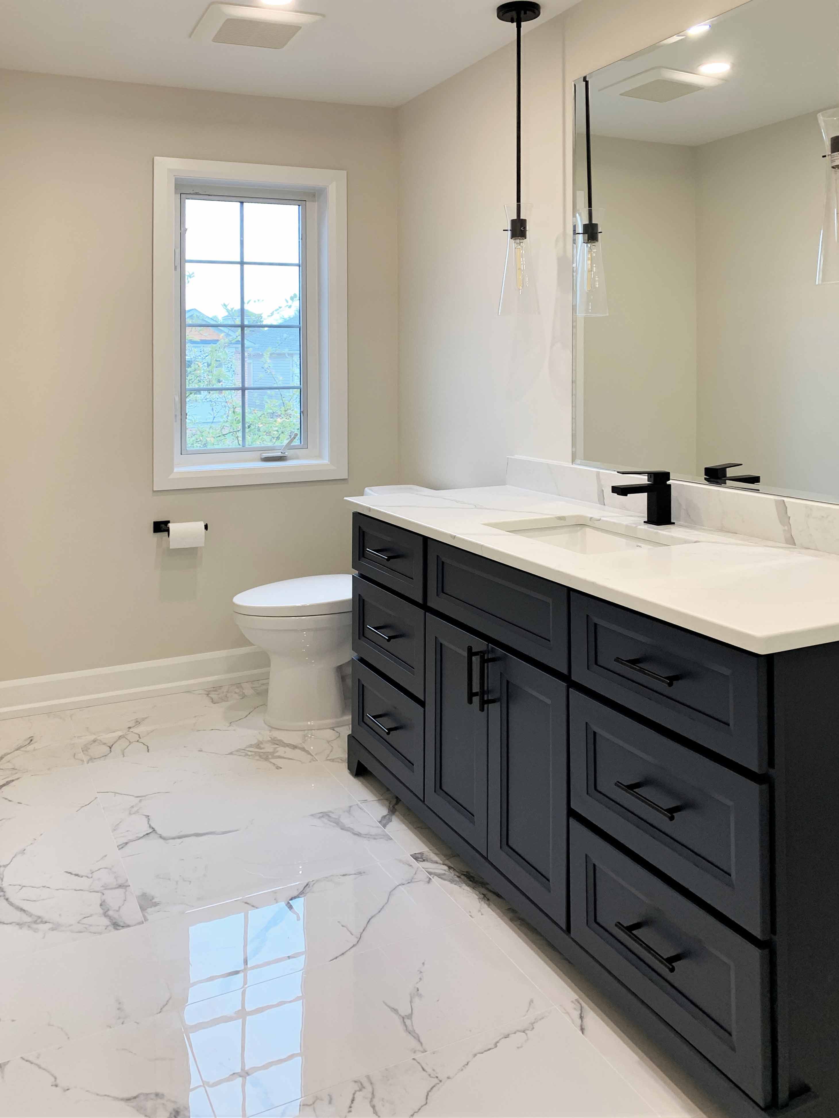 To complete the look, we layered in contrast through a navy-blue vanity and matte black fixtures. This combination delivers a modern palette that feels intentional and sophisticated. For more ideas on mixing finishes, explore our bathroom renovation inspiration page.