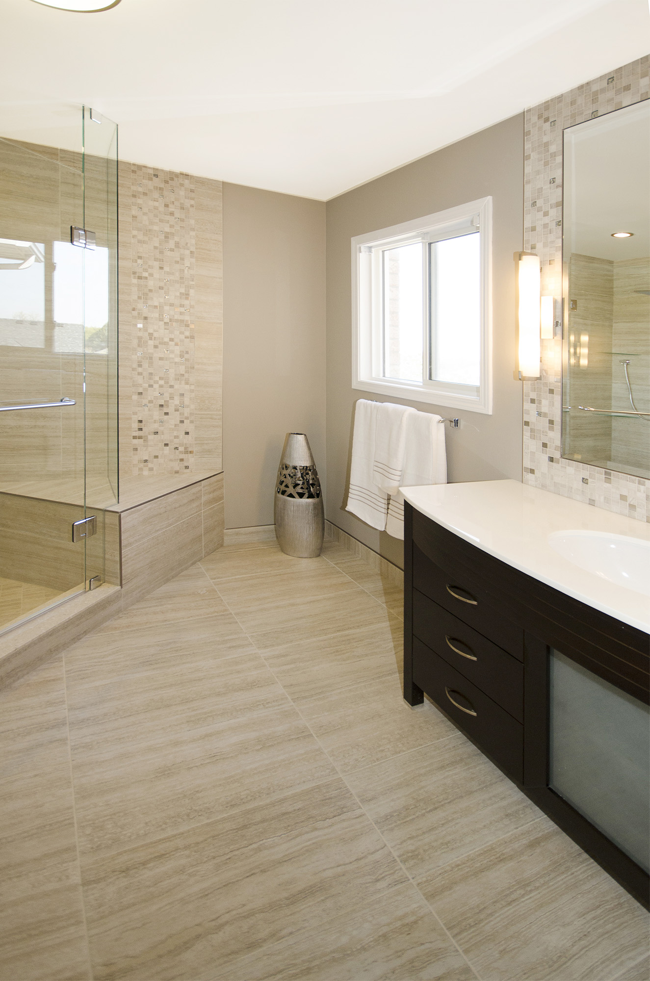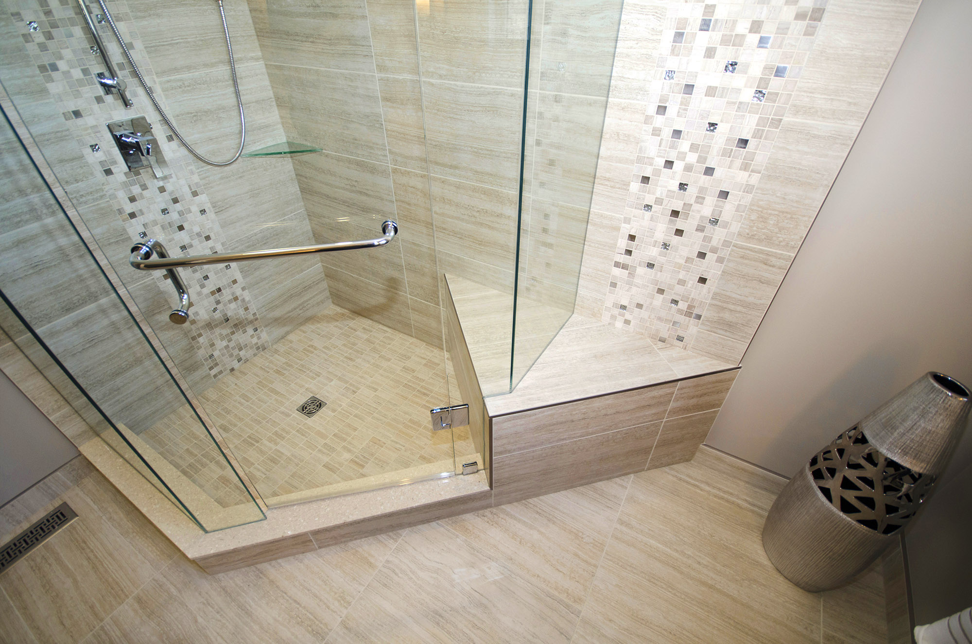 Here is an example of a customer who wanted to do away with a corner bathtub in favor of a large shower. The shower features a double-sided bench. In this design, Floor & Bath Design used a decorative mosaic in the shower and around the custom vanity mirror.