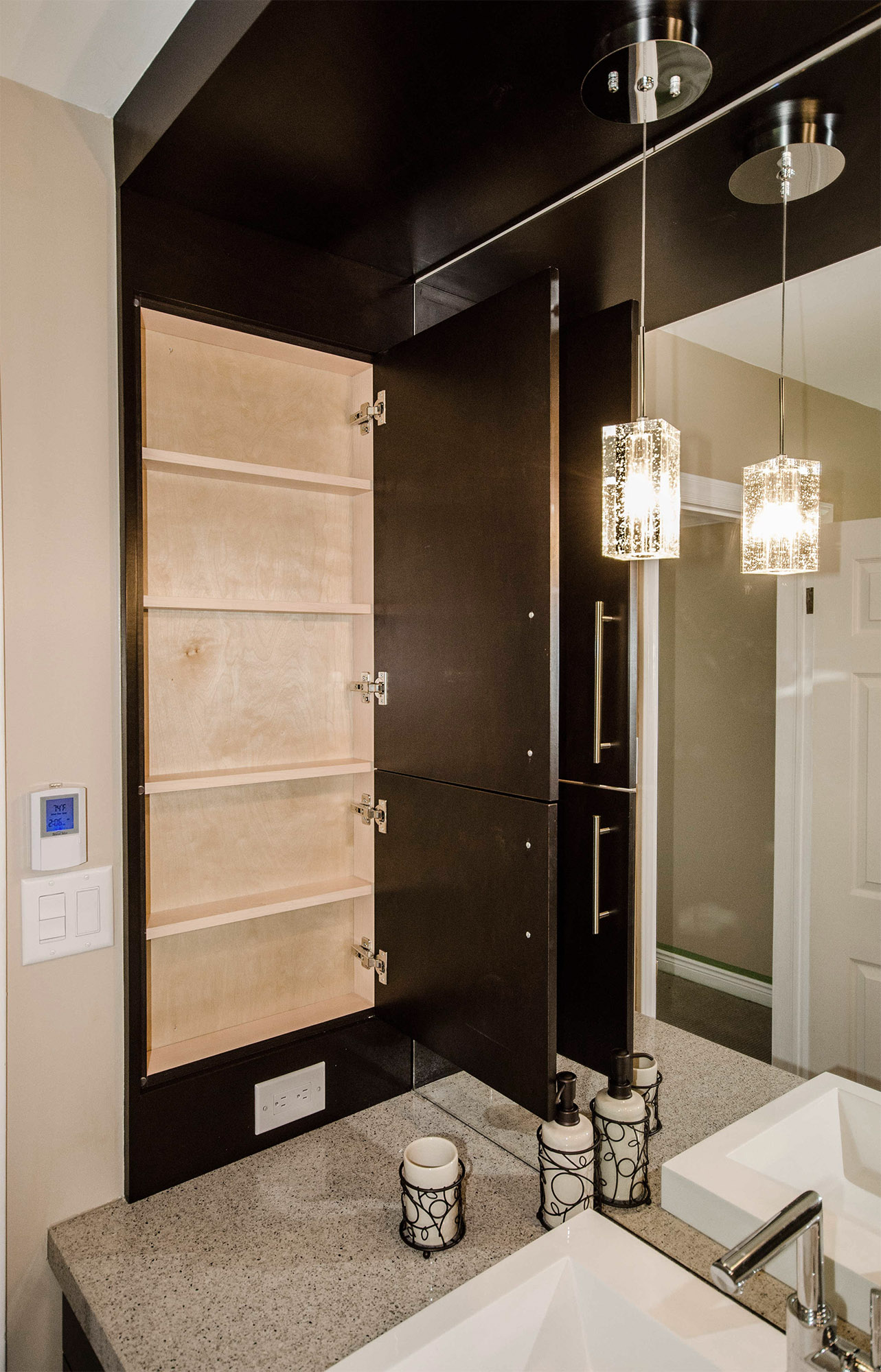 Floor & Bath Design suggested a trough sink to accommodate the customers' request for a lot of storage in their master bathroom. The sink is big enough to act as a double sink, it is classy and creates a unique look.