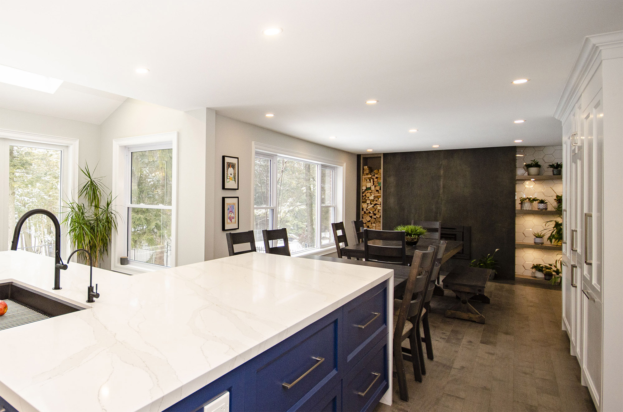 Floor & Bath Design redid the fireplace area. A dramatic fireplace surrounded by porcelain large format ultra-thin 1 cm slabs that runs all the way up to the hight of the ceiling.