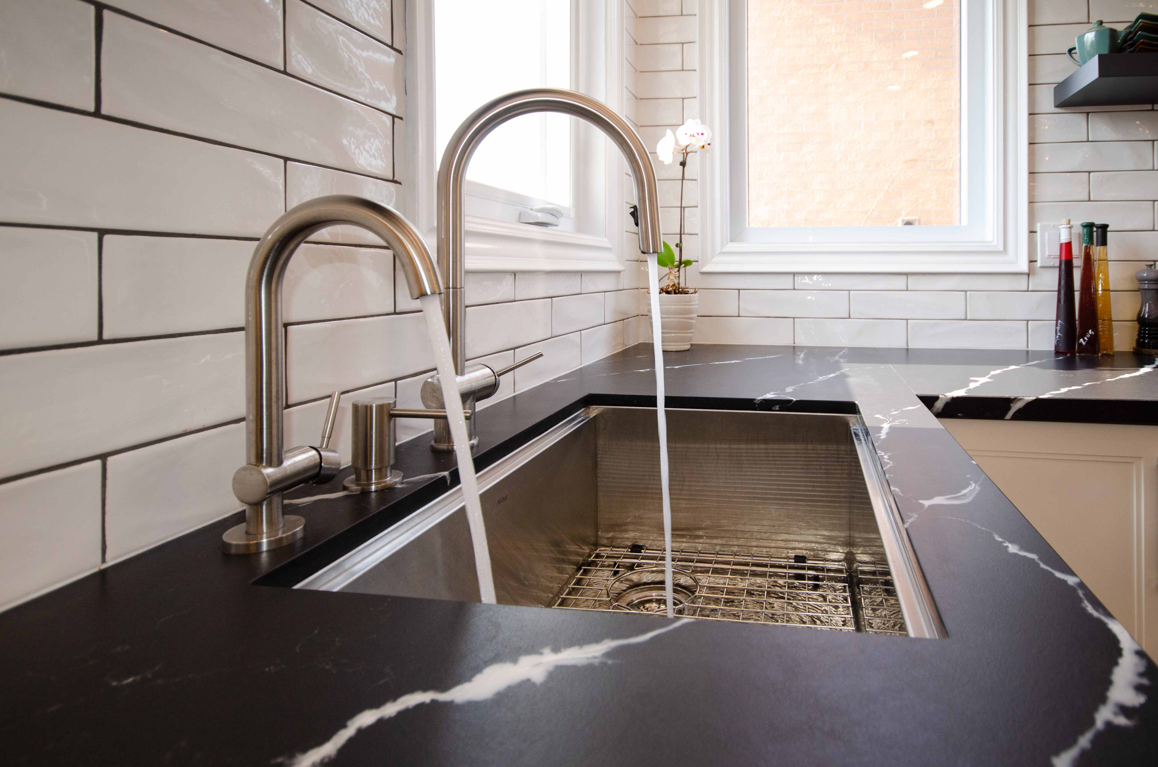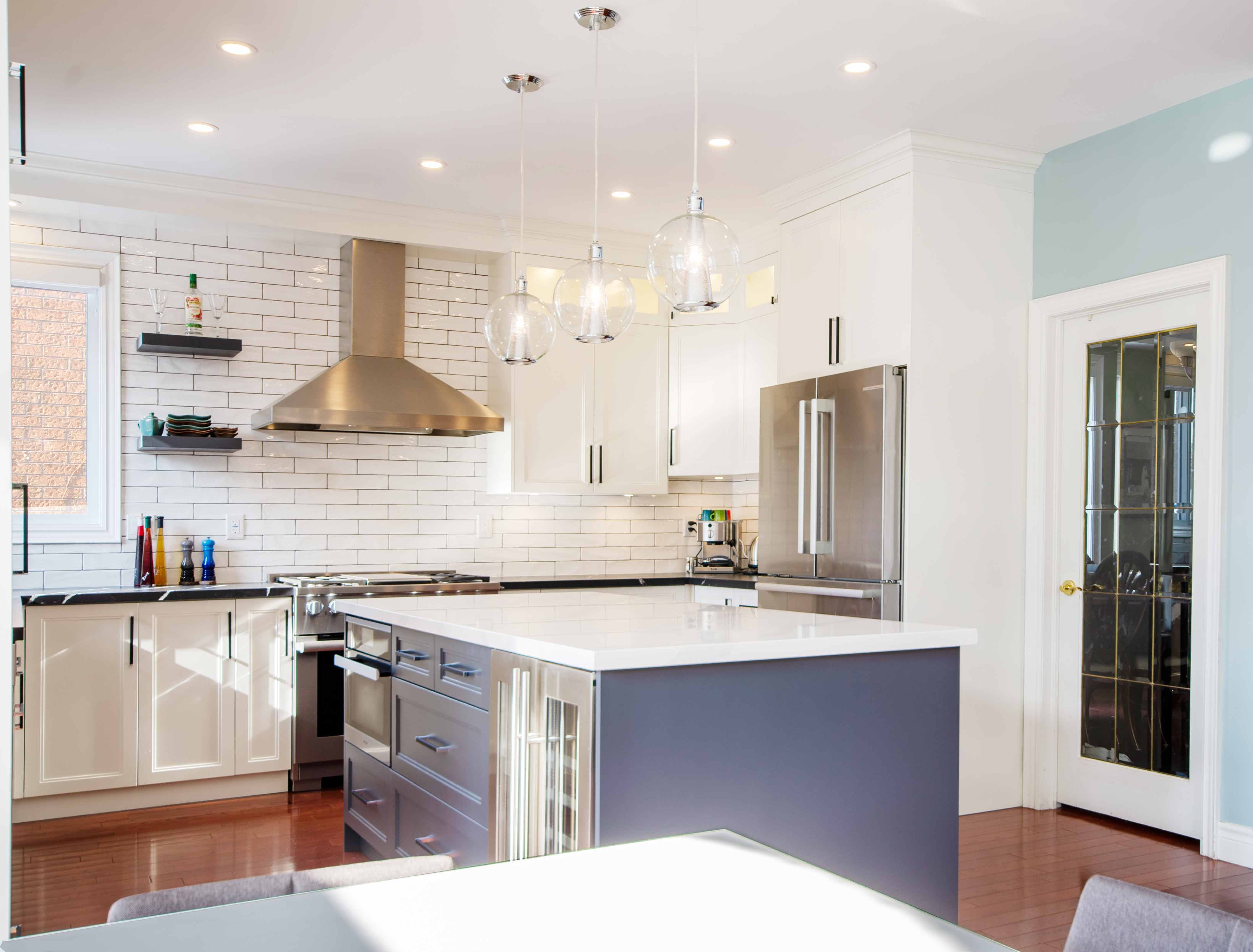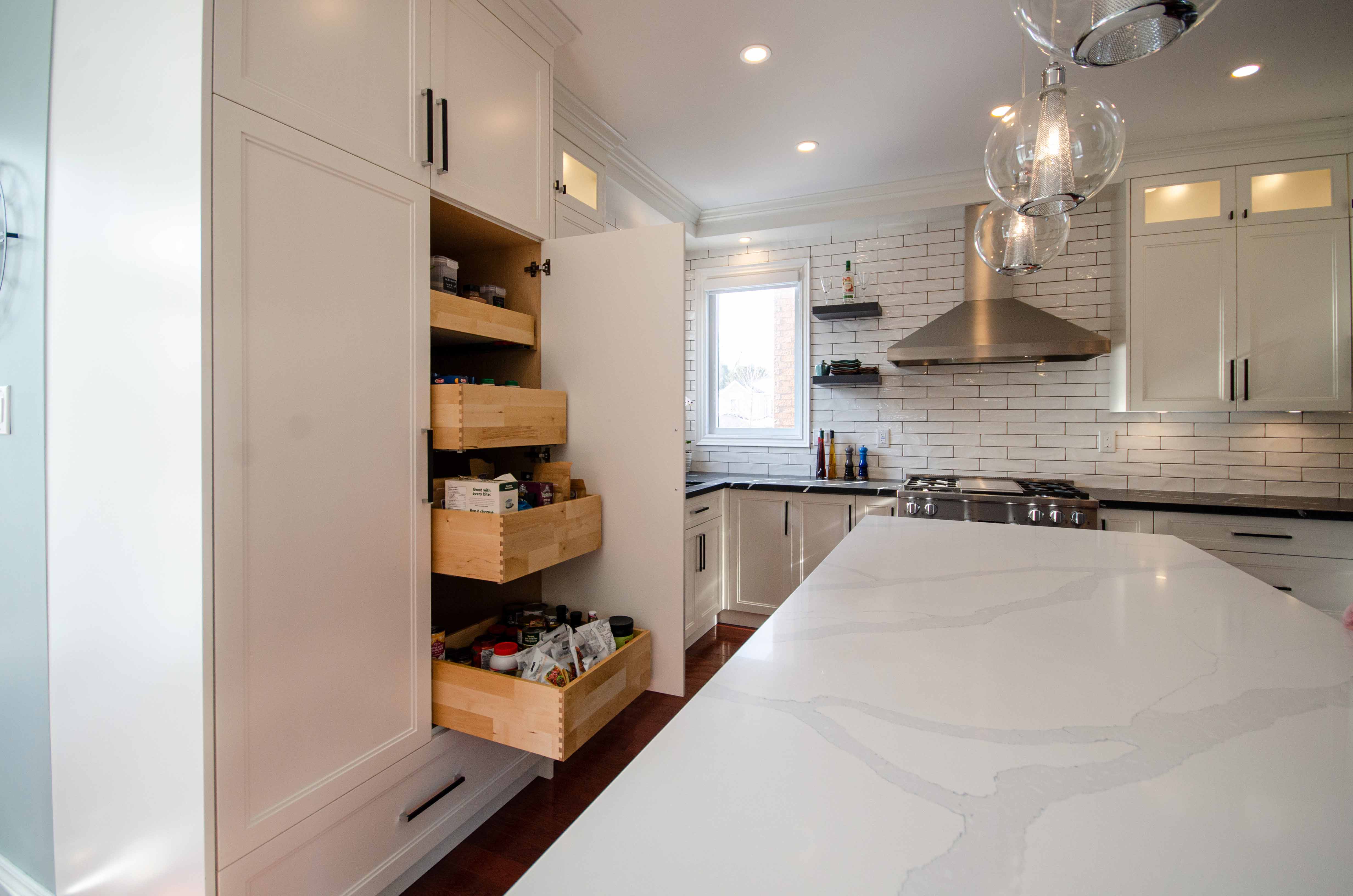 The quartz surface features a soft pattern that complements both cabinet colours and adds gentle movement to the space. Paired with classic white subway tiles, the design strikes the right balance between timeless and modern. This combination also keeps the kitchen feeling bright, a priority for many Pickering homeowners renovating older layouts. Quality materials are always a focus in our projects, and quartz remains one of the most durable surfaces for active family kitchens across the region.