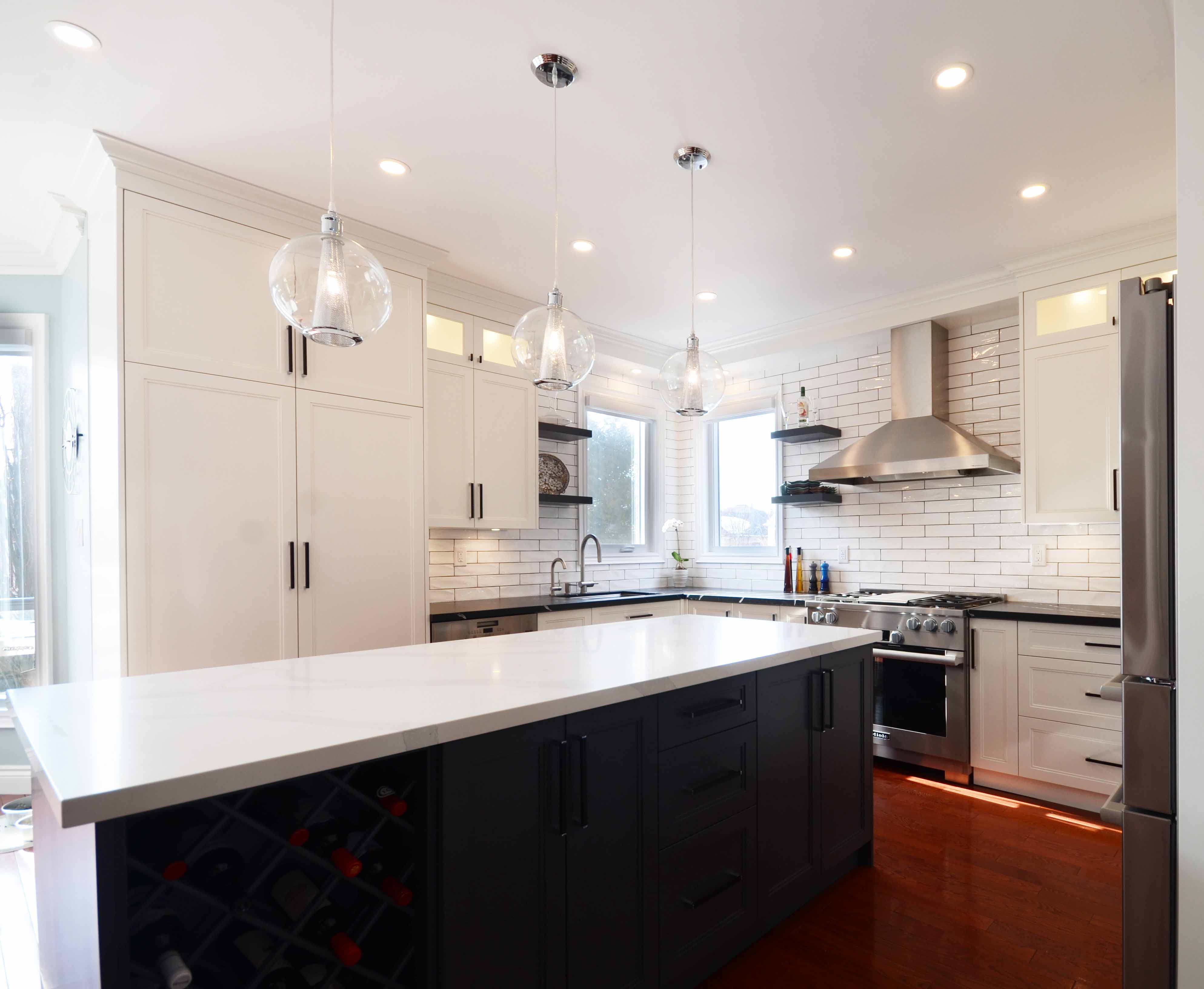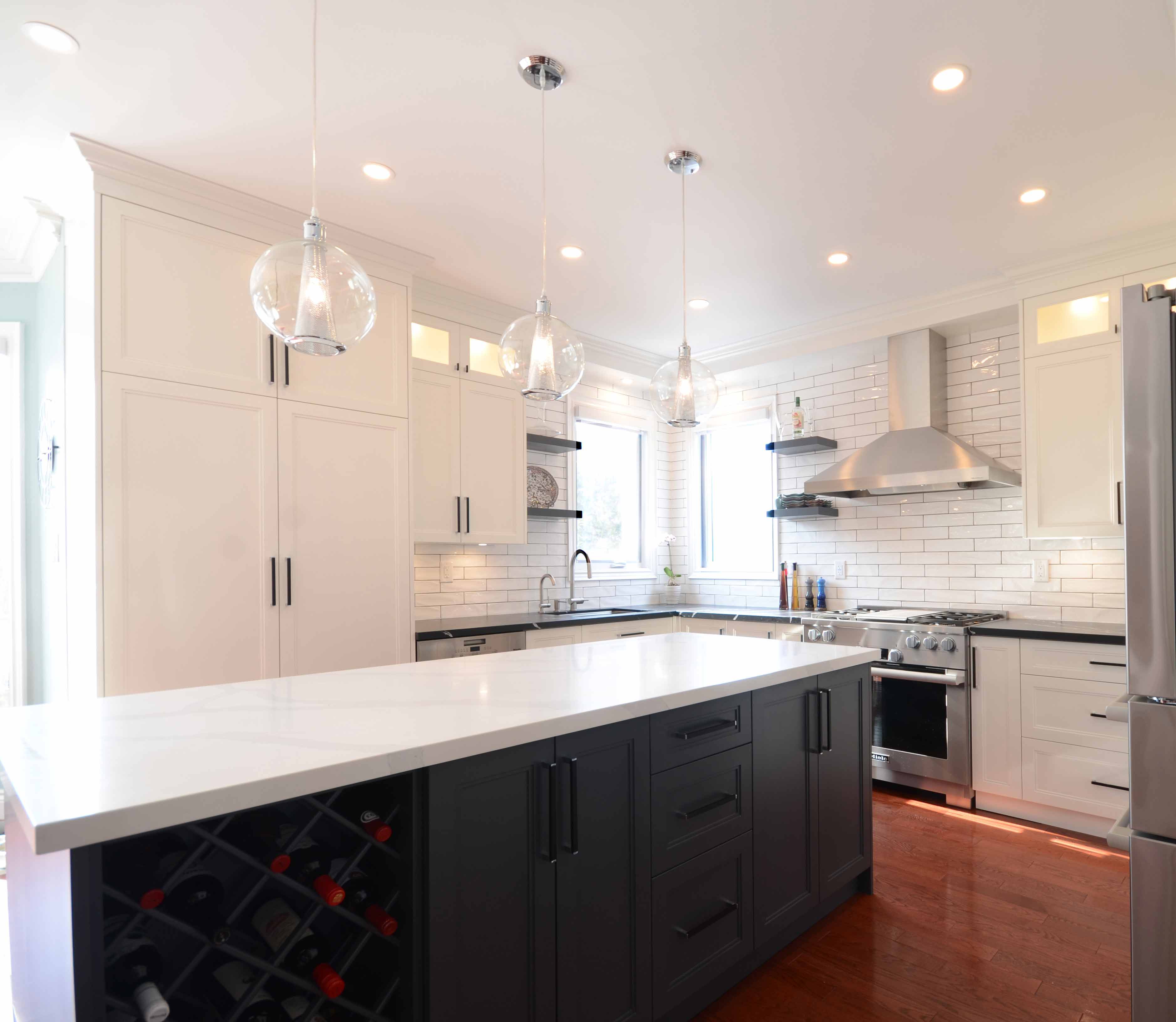 A beautifully balanced mix of contrast and function defines this Pickering two tone kitchen renovation. The design pairs striking black and white quartz countertops with a blend of white and dark grey shaker cabinetry, creating a space that feels modern, bright, and thoughtfully customized. This kitchen brings together clean lines, smart storage, and materials chosen for long term durability. As part of our work across Durham Region, we approached this Pickering project with the goal of elevating both style and everyday use.