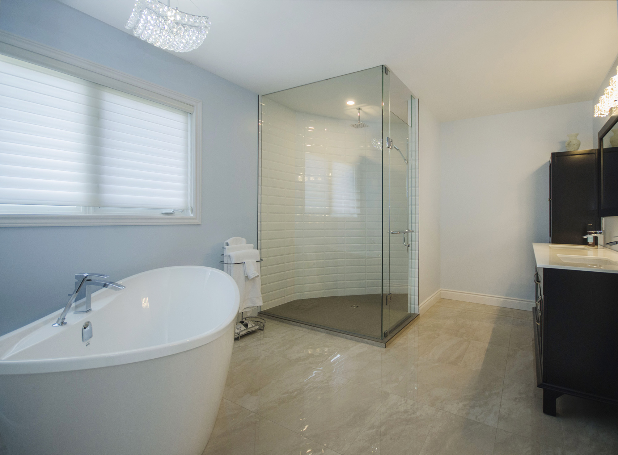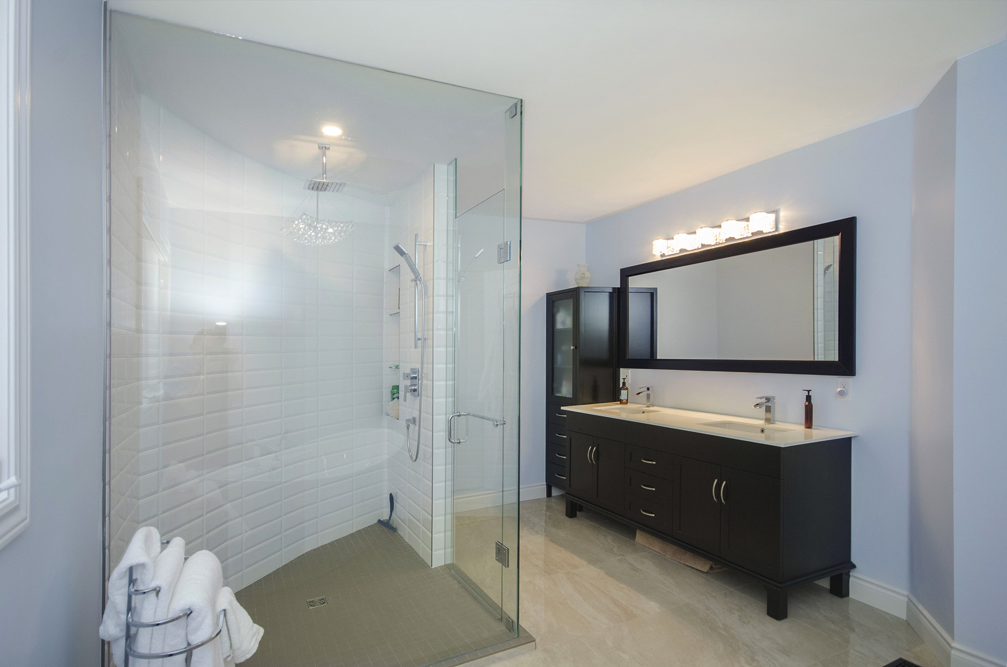 This ensuite has everything that one can wish for. Spacious, double-size shower with a large wall integrated niche. Ceiling-mount shower head for a unique appearance and ease of use.