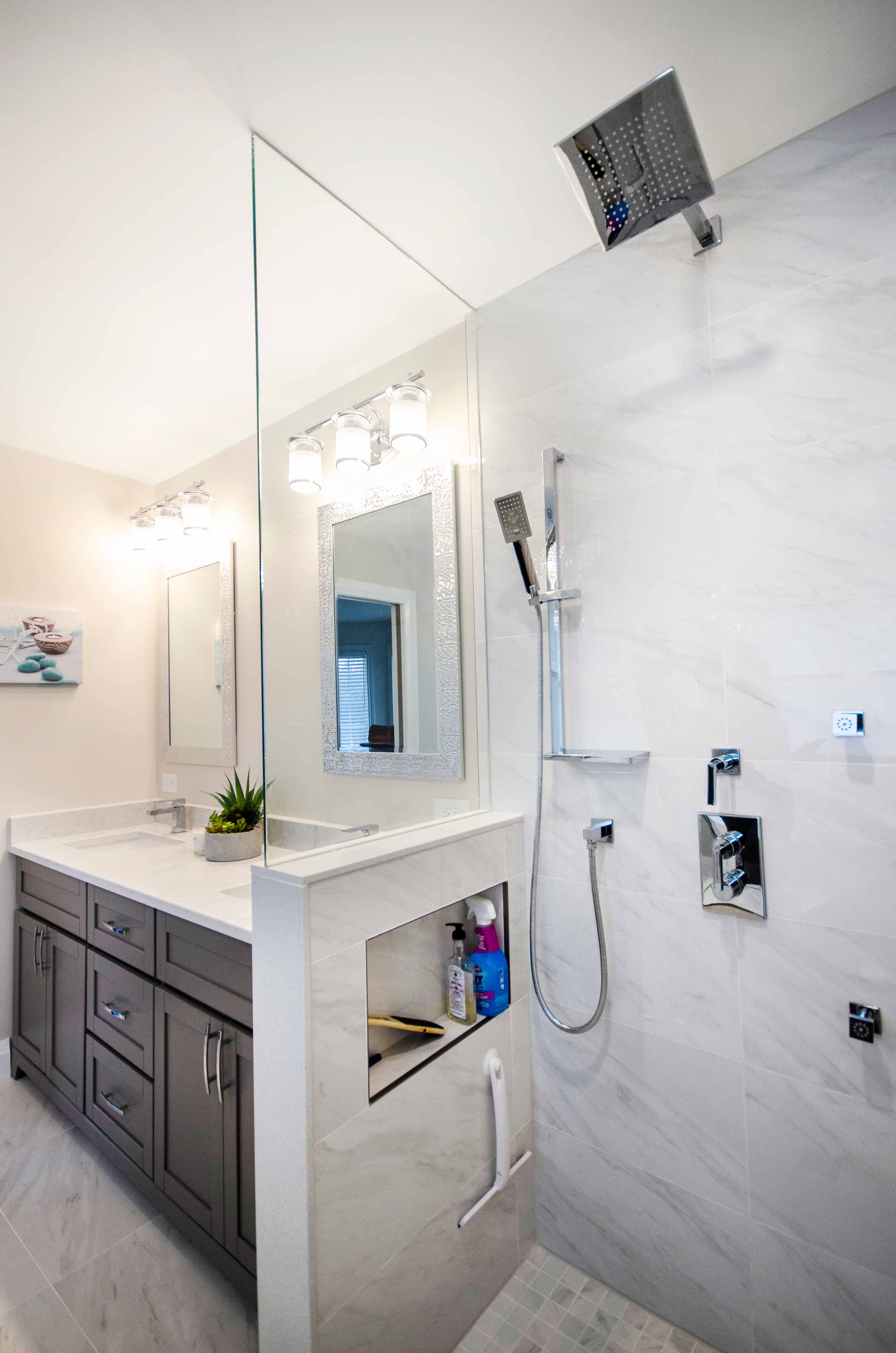 Every design decision in this bathroom renovation was made with functionality in mind. The shelf behind the tub improves storage without intruding on floor space. The shower accent frame creates visual interest while keeping maintenance simple. Each element supports a layout that works for everyday use.